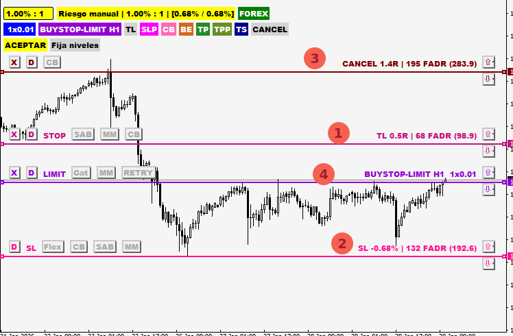 - Si el precio alcanza CANCEL, la orden aún estará pendiente (LIMIT) y se cancelará.
